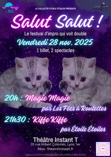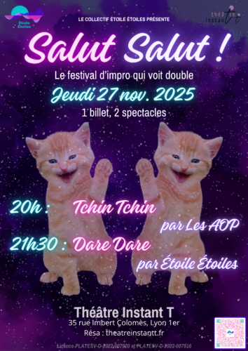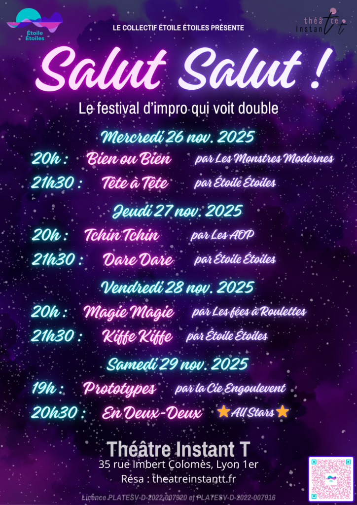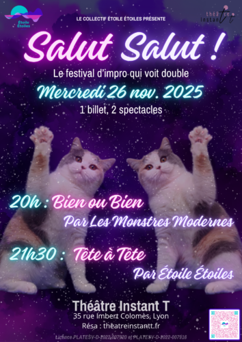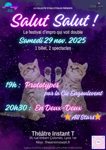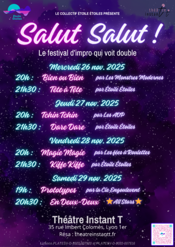 Puis, pour cloturer le festival, un En deux-deux géant avec toutes les compagnies : un spectacle vif, rythmé, où les comédien·nes attrapent en plein vol les idées du public pour les transformer en une fresque aussi joyeuse qu’imprévisible.